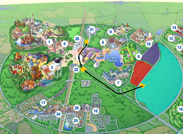 Ferry Boats – This method of transportation could also coexist with the Skyliner. It would take you from just behind Panoramagic to the entrance of the new 5-star hotel, the mid-range hotel, and the entrance of the new park. The route (blue) would follow an already existing water path. This is used in the Magic Kingdom just like buses and the monorail.