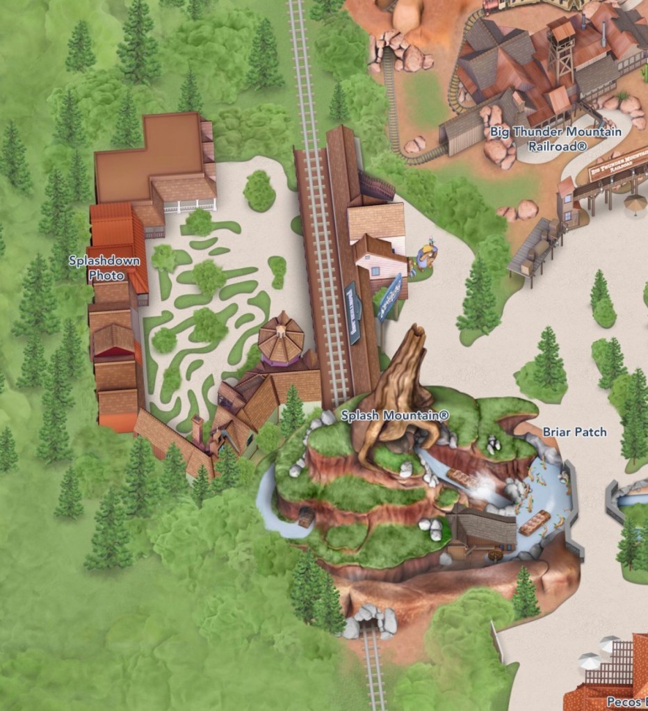 Changes to the paths, railroad tracks, and backstage areas would be necessary. The end result should look something like this, again reminiscent of Disney World’s Splash Mountain.