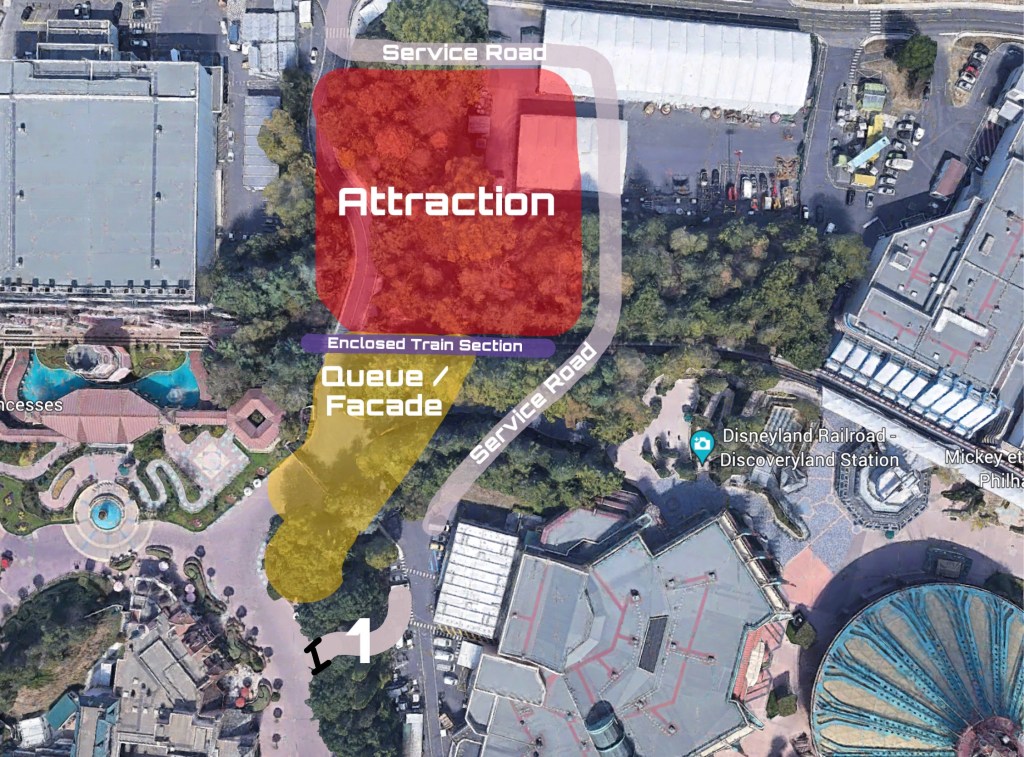 The picture below shows the layout of the building. In the middle there’s a underground/ enclosed train section. The show building is in red, queue and entrance in yellow, a new service road that’s used for the parades and supply of the Videopolis restaurant and a new parade entrance (number 1).