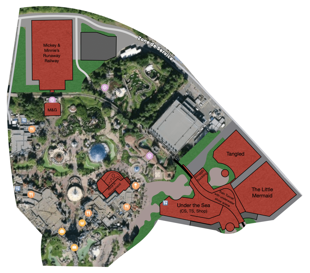 To make the best use of the comparatively little space we have, the underwater grotto area called Under the Sea is built on two levels, with the lower one being half a floor under the current ground level to also keep the show building as unobtrusive as possible. The upper level also has to accommodate the railway tracks which will receive a new show scene that’s also themed to an underwater experience but without the Mermaid IP as to fit in better with the more realistic show scenes of the rest of the train ride (see also Adventureland and Discoveryland).
