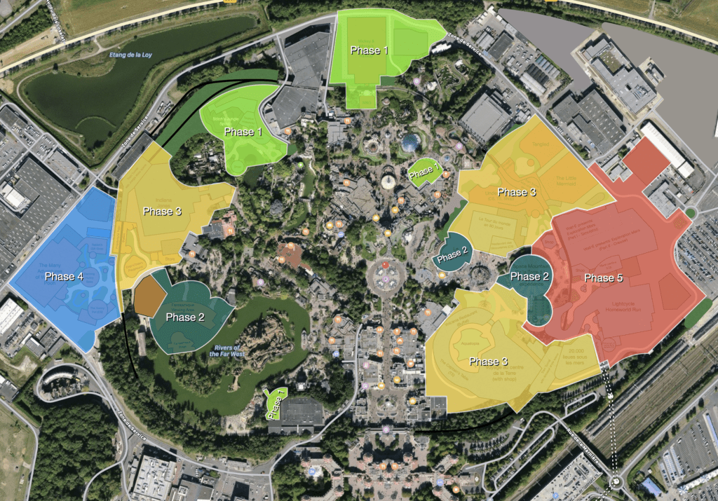 Of course, a massive expansion like the one we’re proposing for DLP would not happen all at once but in several phases and over several years. The following 5 phases were designed in a way that impacts the park’s day-to-day operations as little as possible but there would still be extended times of closed areas and a severe impact on the Disneyland Railroad.