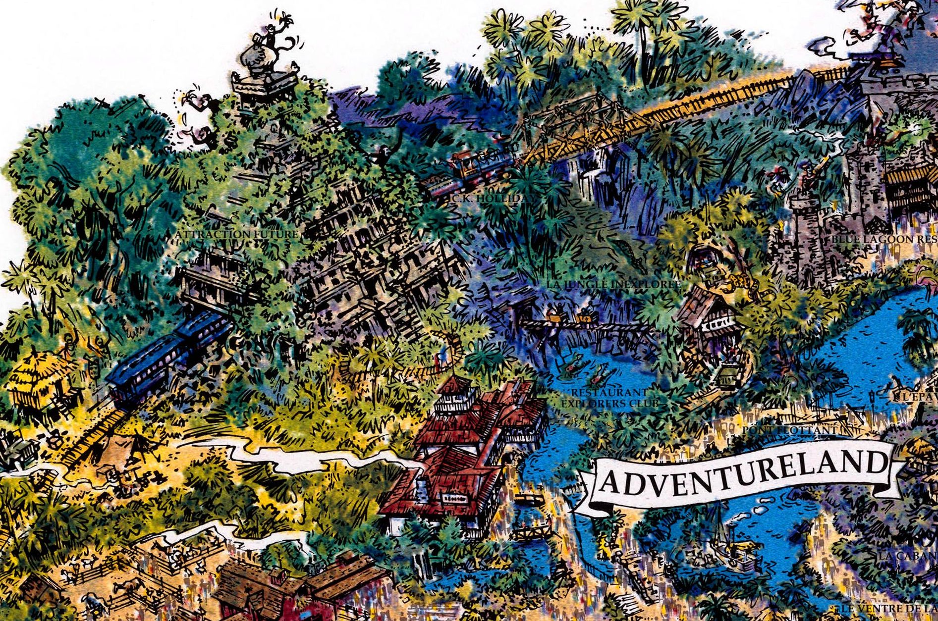 While not much is known about this Disneyland Paris’ version we believe it would’ve been very similar to this abandoned project. Going back to the Fun Map you can easily spot the similarities. Thanks to disneylandparistreasures, we can explore this map in super high detail and zooming in we spot: The train entering the temple, just like in the original concept; the minecarts leaving and entering temples and caves, just like in the original concept; oh and what’s this? The jeeps from, you guessed it, the original concept. Note that, in this map, there is no mention of Indiana Jones, this could simply be because imagineers didn’t want to create a land inside a land so they named this part of Adventureland “La Jungle Inexploree” or The Unexplored Jungle.