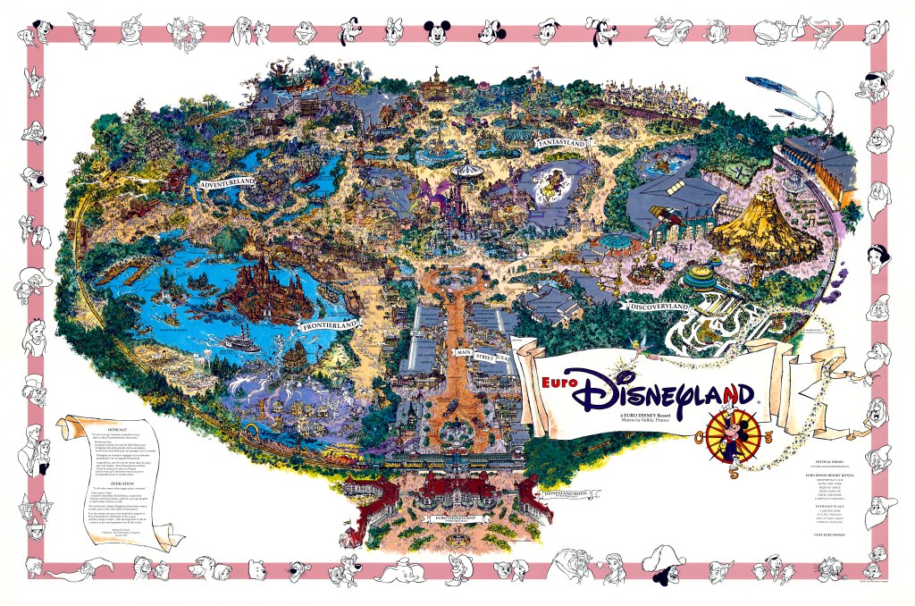 When EuroDisneyland opened in 1992 the company had huge hopes for the future of the resort. This can be seen here, in this Fun Map. There were already a lot of expansions and attractions mentioned in this map that weren’t built at that time, such as: Space Mountain: De la Terre a la Lune (make sure to check our video on this amazing attraction), a Little Mermaid ride, a Beauty and the Beast attraction, and an Indiana Jones themed mini-land…