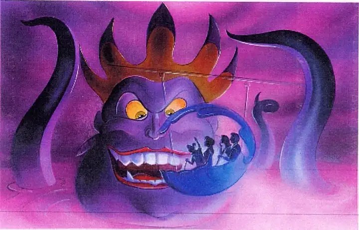 This virtual on-ride video, allows us to gather so many details from what could’ve been. Unlike most dark rides, this one would use a similar ride system as Peter Pan’s Flight, where guests are in an elevated car secured by the top. After boarding the shell vehicle, guests would “dive” into several famous scenes of the movie. The highlight of the ride would be a 4.5 meter tall Ursula that then turns into a giant skeleton, with the help of black light, after Eric defeats her. With the glorious finale guests then return to the loading and unloading area, ready to go back into the park.