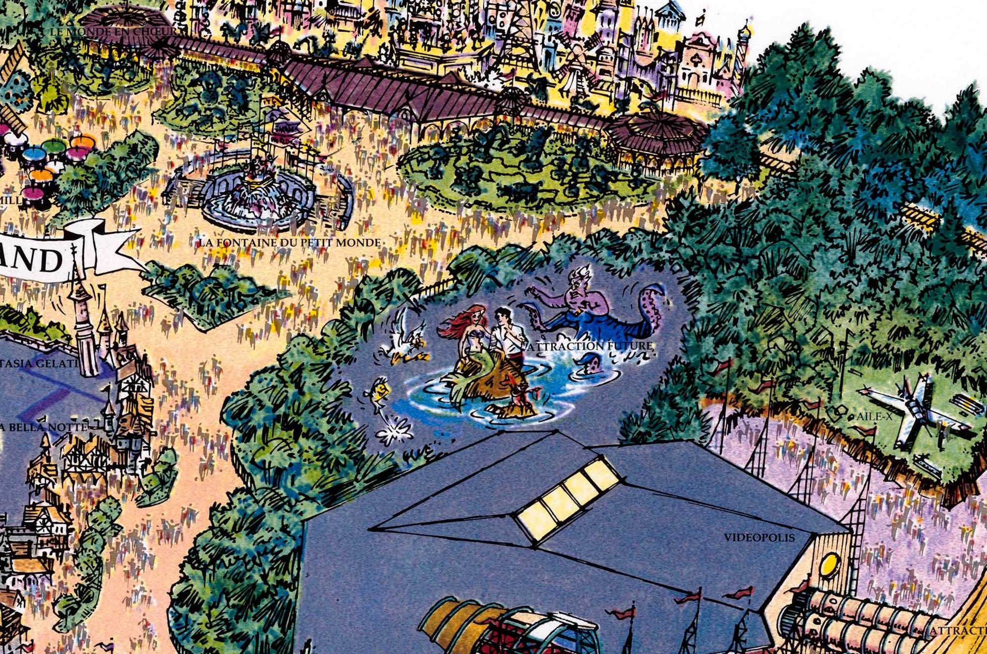 When EuroDisneyland opened there was a fun map being sold that contained several attractions that never came to be, some of these we’ve actually discussed like Discovery Mountain, the Indiana Jones mini-land and the Beauty and the Beast show. Another attraction that was somewhat present was the Little Mermaid attraction.