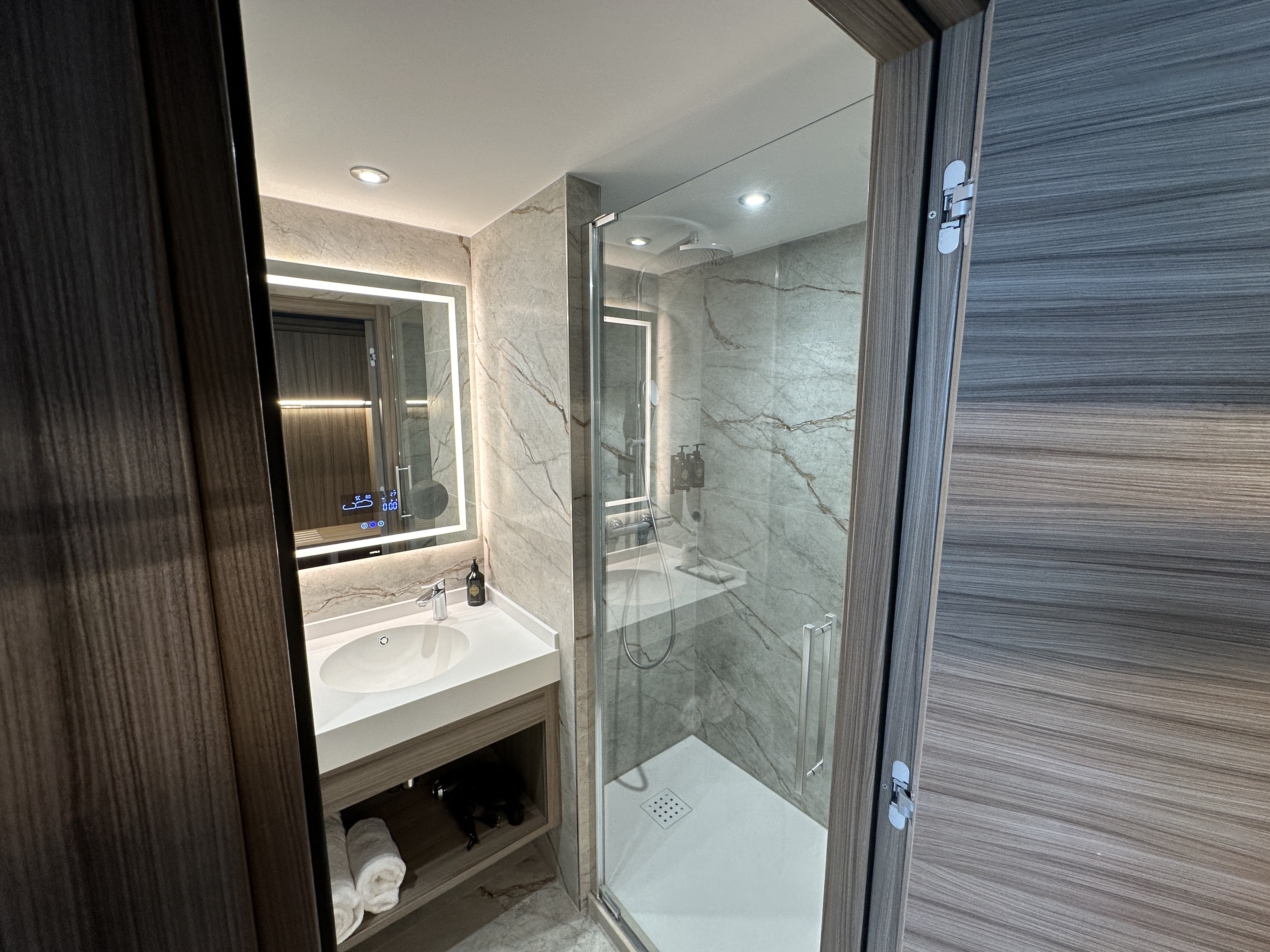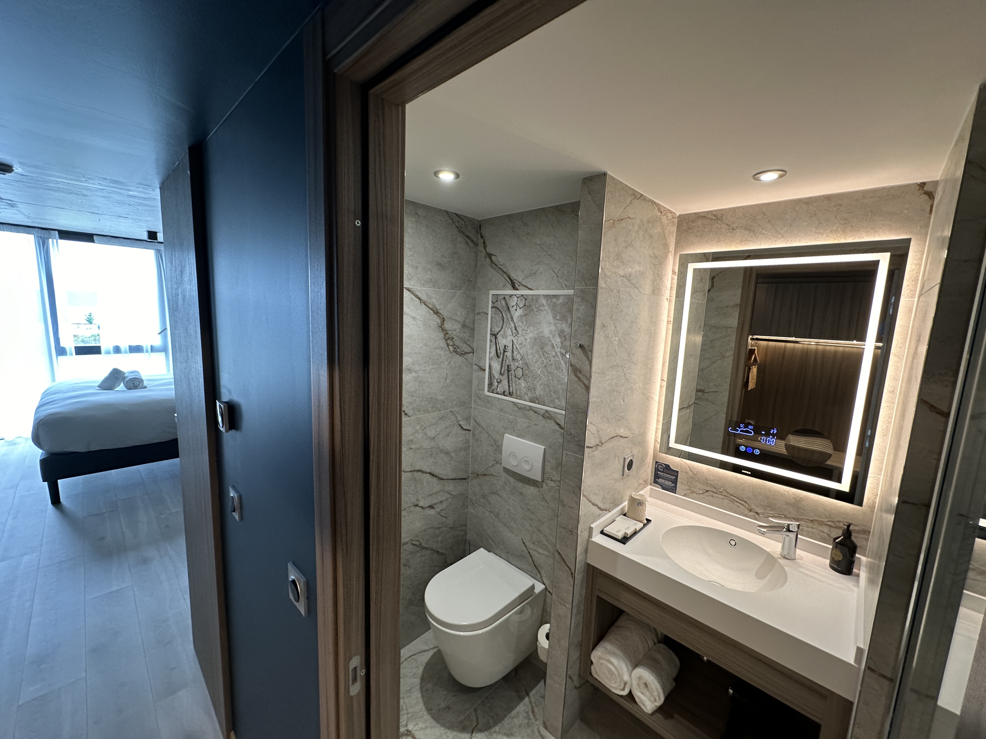 After scanning the QR Codes, the door opens and I enter what is an amazing hotel room. I had a great king-sized bed, but there are other types available. On your right, after coming into the room, is the bathroom rocking a magnificent shower and a high-tech mirror that tells the time and weather; however, this didn’t always work.